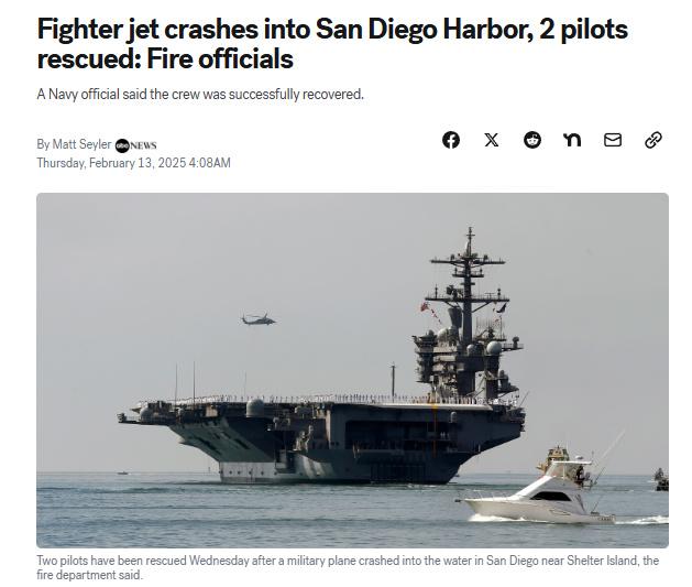 中新网2月13日电 据美国广播公司(ABC)援引美国圣迭戈消防救援队消息,当地时间2月12日上午,一架战斗机在加利福尼亚州圣迭戈港坠毁,机上两名飞行员已弹射逃生。